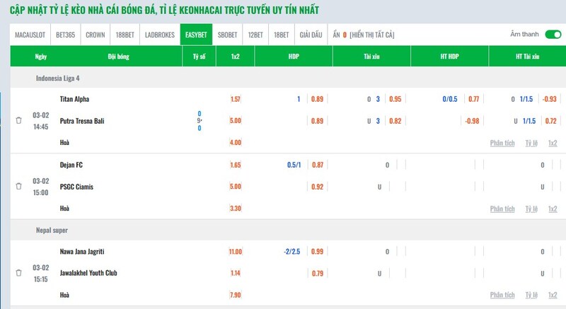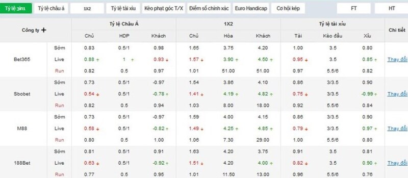Cập nhật ty le keo nha cai real-time thời gian thực